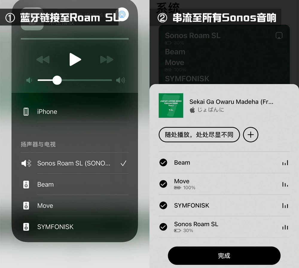 比如将Roam SL加入我现有的Sonos系统中,然后通过手机蓝牙连接至Roam SL播放音乐,各个房间的One、Beam、Move、Symfonisk,都能同步播放蓝牙推送的音乐了。是不是感到特别的熟悉而亲切?